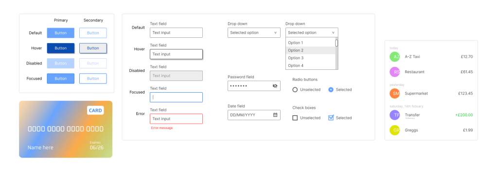 - UI Components – Designed essential components such as buttons and form fields, considering various states and accessibility requirements.