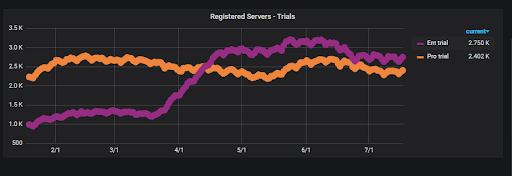 RealVNC were tracking a metric called ‘Registered servers’. This metric showed the number of instances of their ‘VNC Server’ (part of VNC Connect) software that had been licensed by the customer signing into their account. We had no metric for the number of licence keys applied manually.