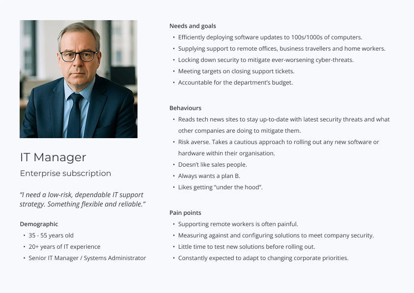 I documented these sessions and used empathy mapping to convey key insights. These findings, combined with survey responses and behavioural data, allowed us to develop a clear set of personas. Our primary user emerged as the IT Manager or System Administrator. To keep these personas front and centre, I created a sharable slide deck and even a set of desk-friendly persona cards for quick reference.